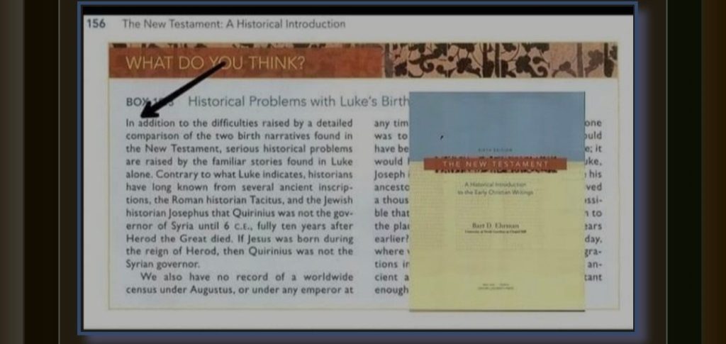 “Além das dificuldades levantadas pela comparação detalhada das duas narrativas do nascimento encontradas no Novo Testamento, sérios problemas históricos surgem nas histórias que aparecem apenas em Lucas. Ao contrário do que Lucas indica, historiadores há muito sabem por várias inscrições antigas, pelo historiador romano Tácito e pelo historiador judeu Flávio Josefo, que Quirino não era governador da Síria até 6 d.C., dez anos após a morte de Herodes, o Grande. Se Jesus nasceu durante o reinado de Herodes, então Quirino não era governador da Síria.”